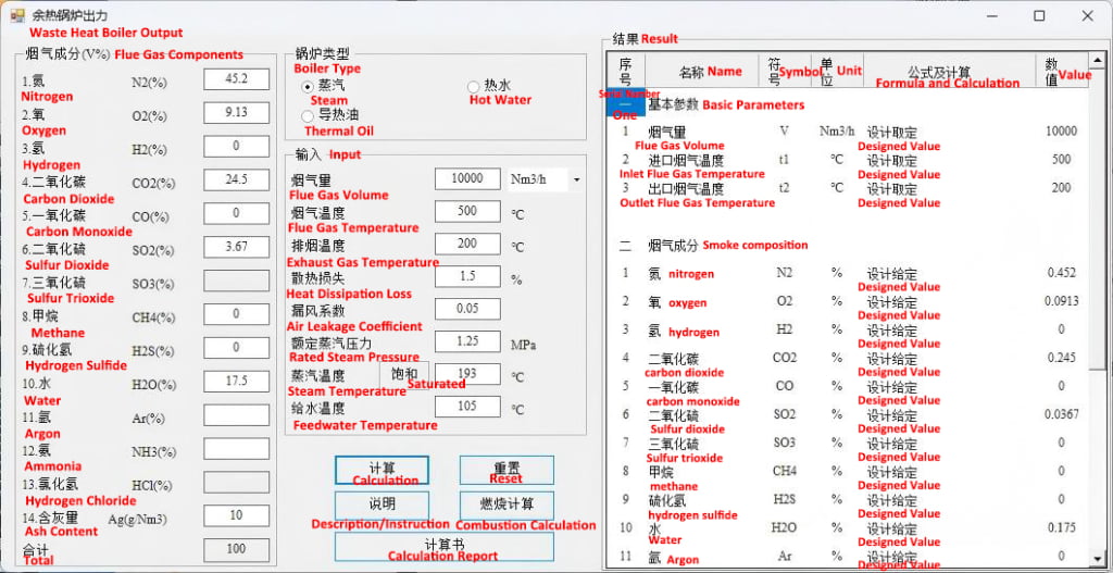 - Calculate flue gas volume and composition using fuel consumption, fuel calorific value, and excess air coefficient.